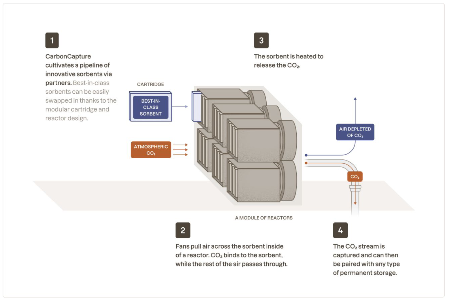 CarbonCapture uses a temperature-vacuum swing adsorption (TVSA) direct air capture process. In capture mode, a fan blows air over an amine-based sorbent. After CO2 has adsorbed on the surface of the sorbent, a shutter closes at the front of the reactor and a vacuum is applied to remove residual air. Steam is then added to heat the sorbent to ~100 C, thereby releasing the CO2. The resulting CO2 stream is then ready for compression, transport, and storage.