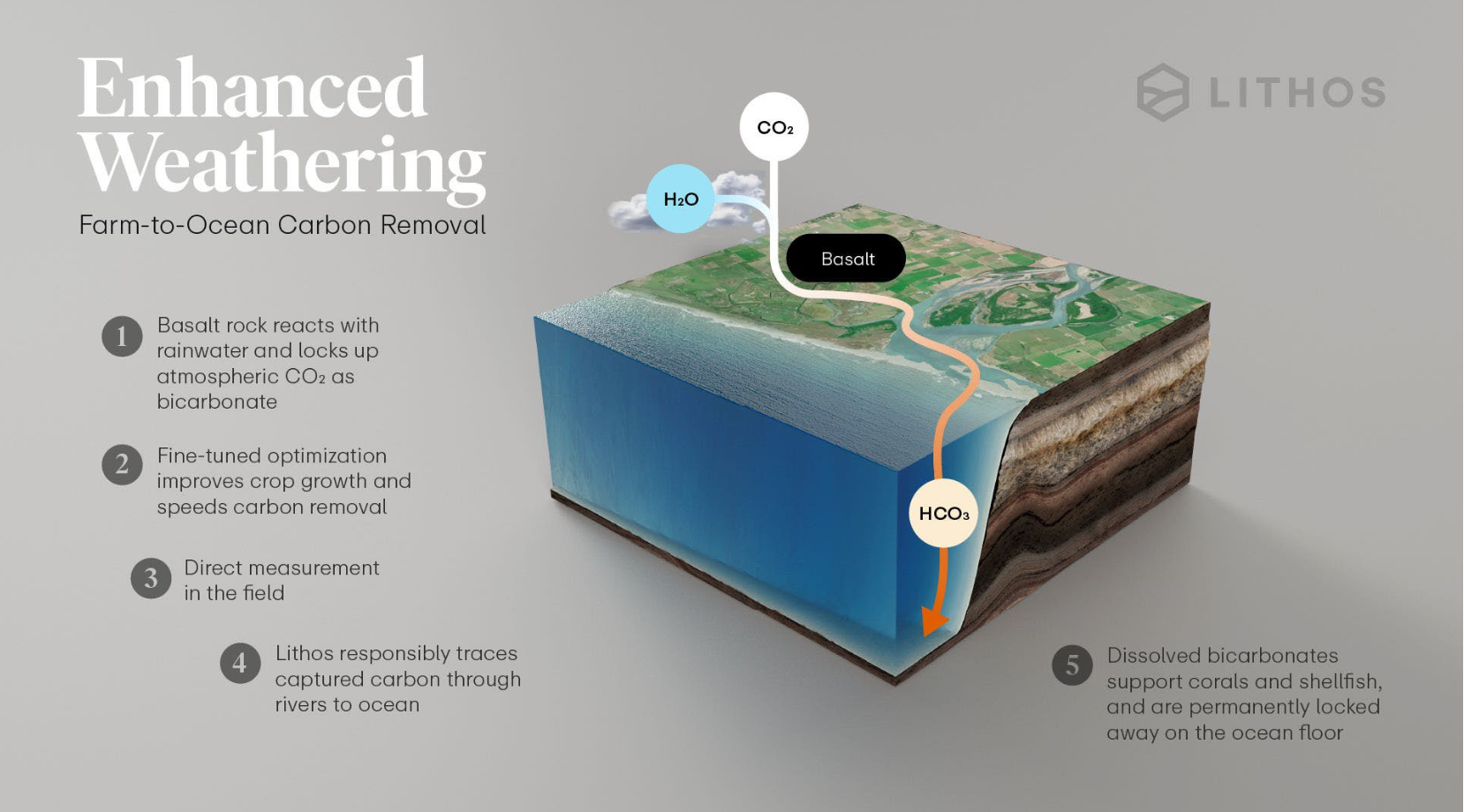 Basalt is another candidate for this kind of enhanced weathering. In some experiments, farmland treated with ground basalt not only captured carbon, but also grew more crops as the basalt helped the soil hold onto needed nutrients. Other ideas for enhanced weathering try to speed up the chemical reactions involved. This might be done by adding chemical catalysts, or living things like bacteria or lichens— anything that eases the path for carbon to bind with elements in the rock.